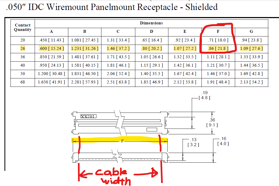 If you do the math, a single 26 conductor 0.05" pitch ribbon cable would have a width of approximately 1.3" (0.05" x 26cond = 1.3") , which is way too wide for your connector. However, a 13 conductor 0.05" pitch ribbon cable would have a width of approximately 0.65", which is much closer.