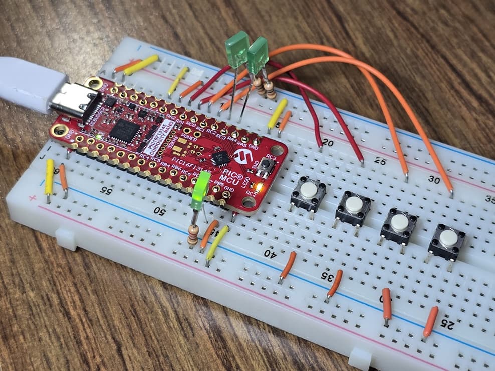 図1: 筆者の作業台に設置されたMicrochipの PIC16F13145 のブレッドボードの画像