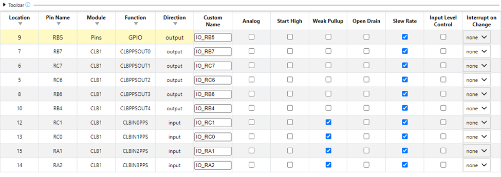 各入力は出力ピンに直接ルーティングされています。例えばCLBIN3PPS はPPS_OUT3 にルーティングされています。