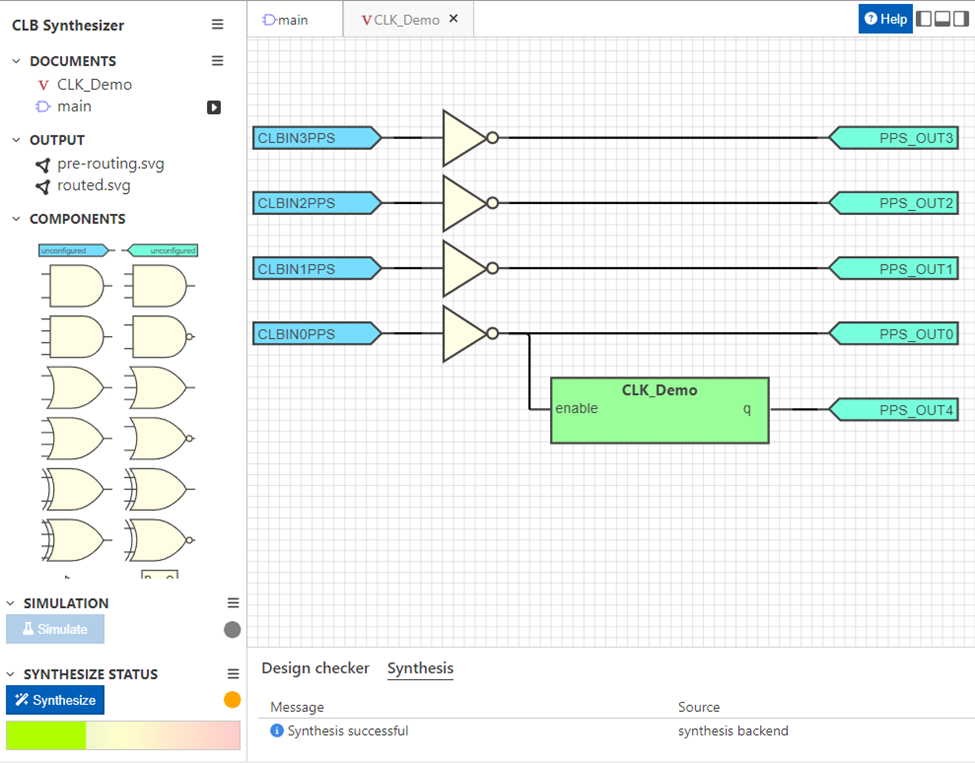 PICと同じクロックドメインで動作するようにプログラムすることもできます。例えば、各ブロックには選択可能なクロックソースを備えた同期ロジックが搭載されています。CLB入力は、メインのマイクロコントローラの高周波発振器やタイマオーバーフローなどの他の信号に同期させることができます。