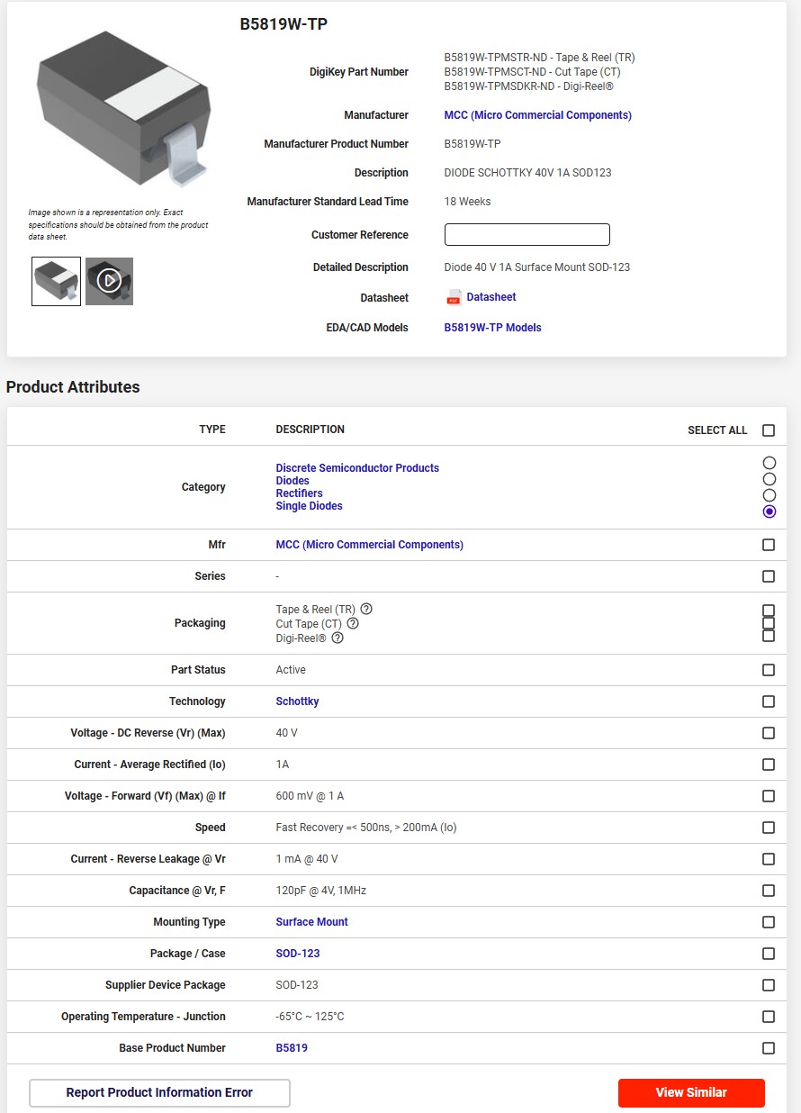 If you need through hole, that other part might be suitable enough. The DC reverse voltage is a maximum rating. Technically, it would fail at a lower voltage compared to B5819W-TPMSCT-ND. This can be a gray area because I don’t know what the diode is being used for in the circuit, but the board voltage is 5V. So technically speaking, the 40V choice is already overkill. Keep in mind that this through hole variant has a lower forward voltage drop. This is more concerning as I don’t know to what degree the output voltage needs to be tuned to. Again, it kind of depends on what the diode is used for. I would actually recommend 1N5819-TPCT-ND as it is closer in forward voltage.