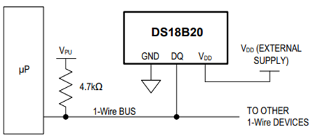 El sensor de temperatura Analog Device DS18B20 se puede alimentar como tradicionalemente se hace, con una fuente de potencia externa conectandose al pin VDD como se muestra en el próximo diagrama de bloque si es necesario,