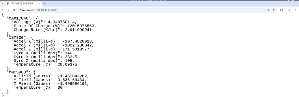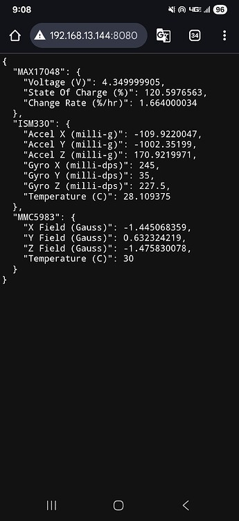 Cualquier otro artefacto conectado al router WiFi con acceso al “LAN” puede recibir el SparkFun DataLogger IoT - 9DoF. En el terminal se ve la data del MAX17048 micropower current fuel gauge, el ST ISM330 accelerometer/gyro inertial module, y el High Performance 3-axis Magnetic Sensor. en el “web browser”. Por ejemplo, si un célular esta conectado al “WiFi Hotspot” se puede ver en el “browser” así,