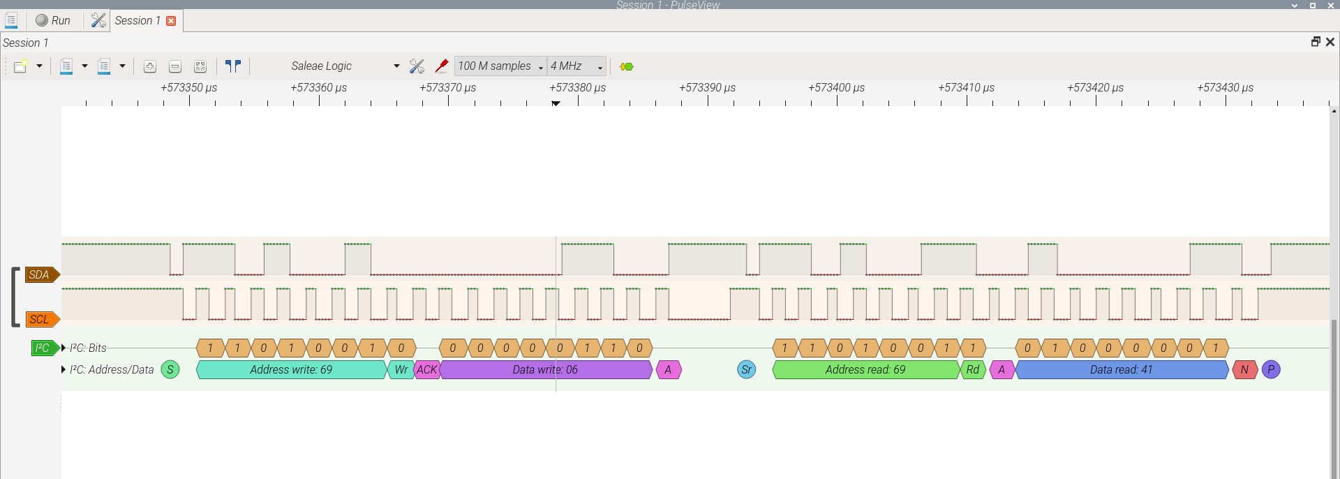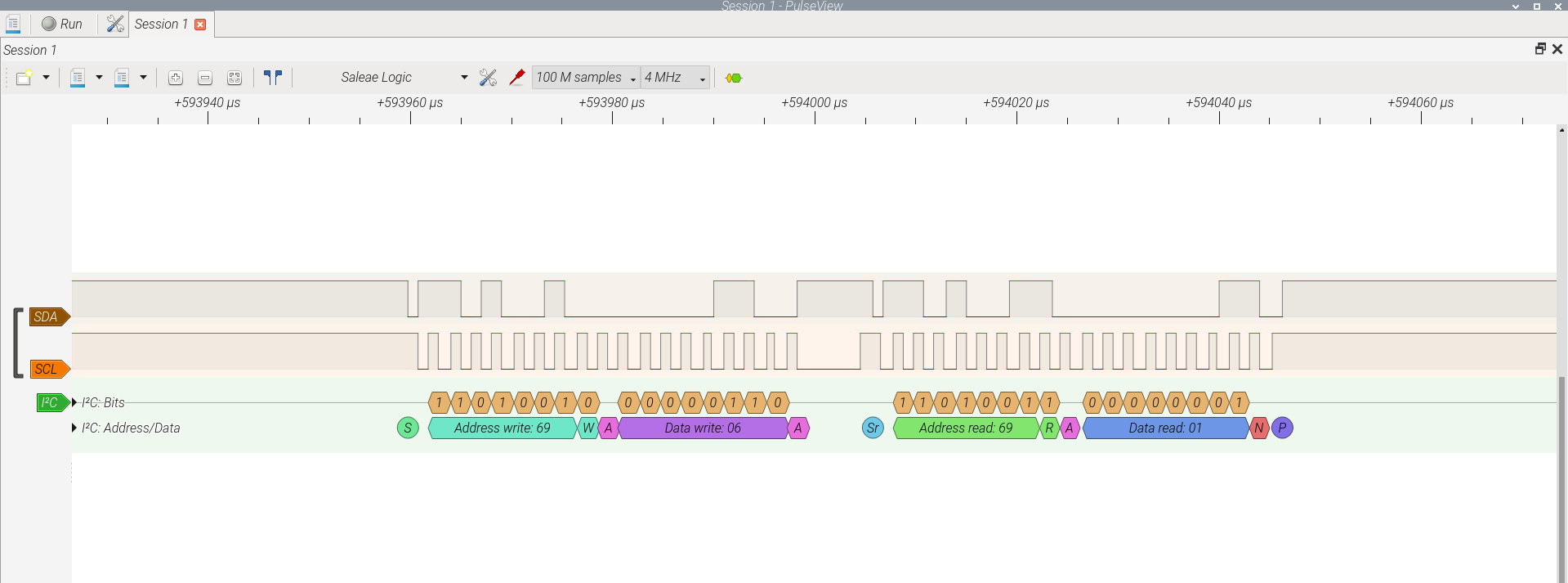 The Sparkfun 8-channel USB Logic Analyzer confirms that this Zephyr C program running inside the Raspberry Pico 2 using only the I2C definition in the Zephyr OS overlay works. The proper sequence I2C interface I2C_MSG_WRITE, I2C_MSG_WRITE, I2C_MSG_STOP defined in the main.c developed here at Digikey for the I2C write internal finite state machine is followed. Also the I2C_MSG_WRITE, I2C_MSG_RESTART, I2C_MSG_READ, I2C_MSG_STOP of the I2C read internal finite state machine is followed. The next logic analyzer snapshots, show what is happening inside the I2C bus interface as the Zephyr C program running inside the Raspberry Pico 2 is interacting with the sensor,