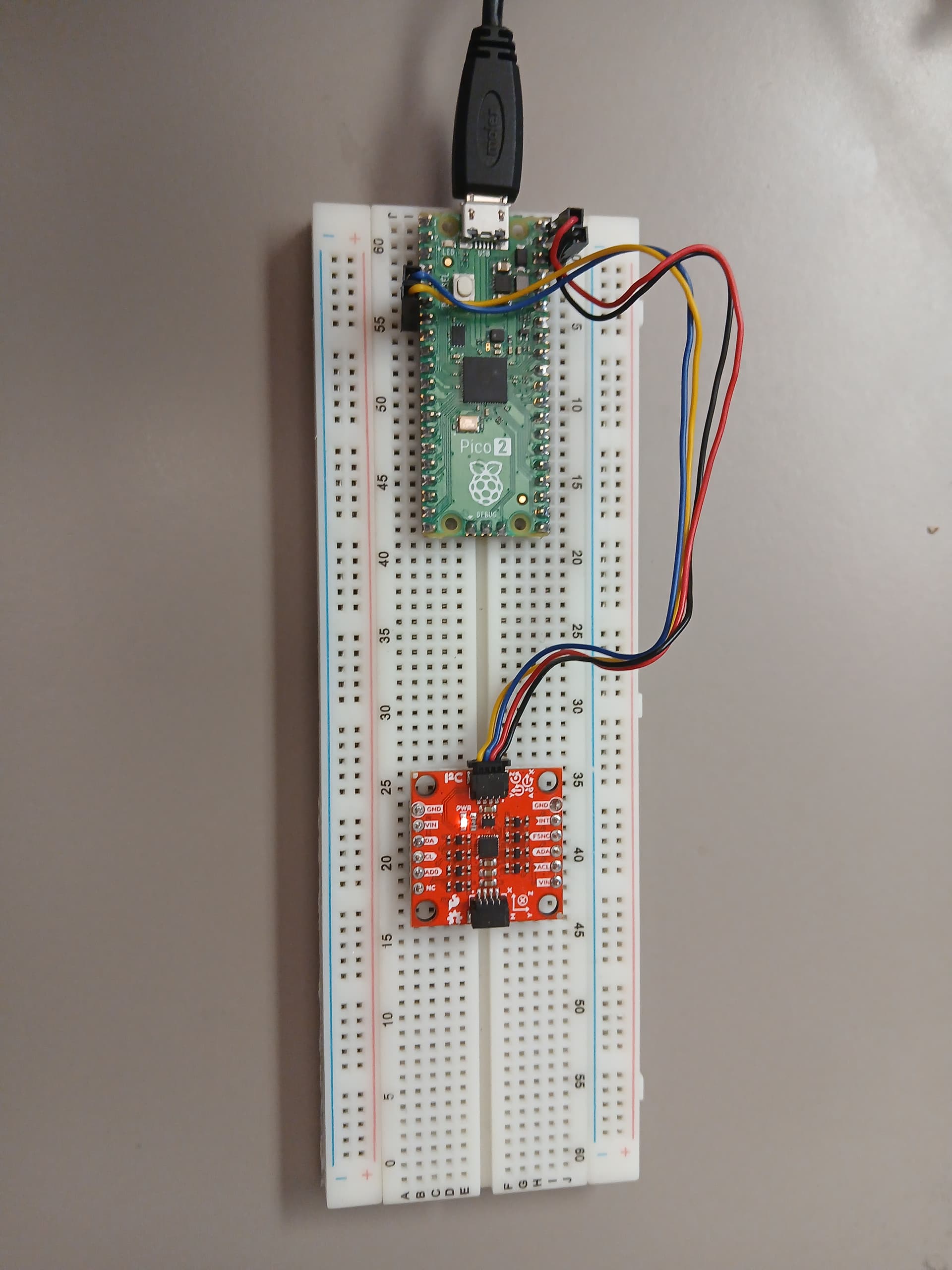 El sistema operativo Zephyr shell uart~$ surge despues del proceso de instalación. Ahora use la interfaz I2C de la Raspberry Pico 2 para conectar al TDK ICM 20984 de Sparkfun. La próxima foto muestra como esta conectado el Raspberry Pico 2 al sensor vía I2C en la “breadboard” disponible en DigiKey y también usando estos cables Qwiic.